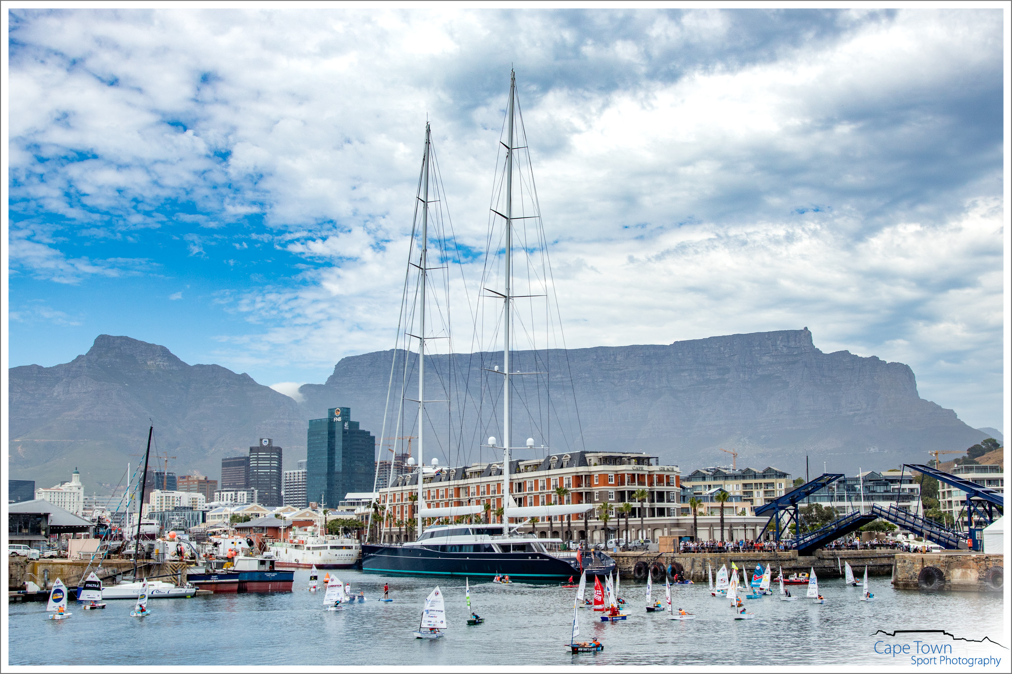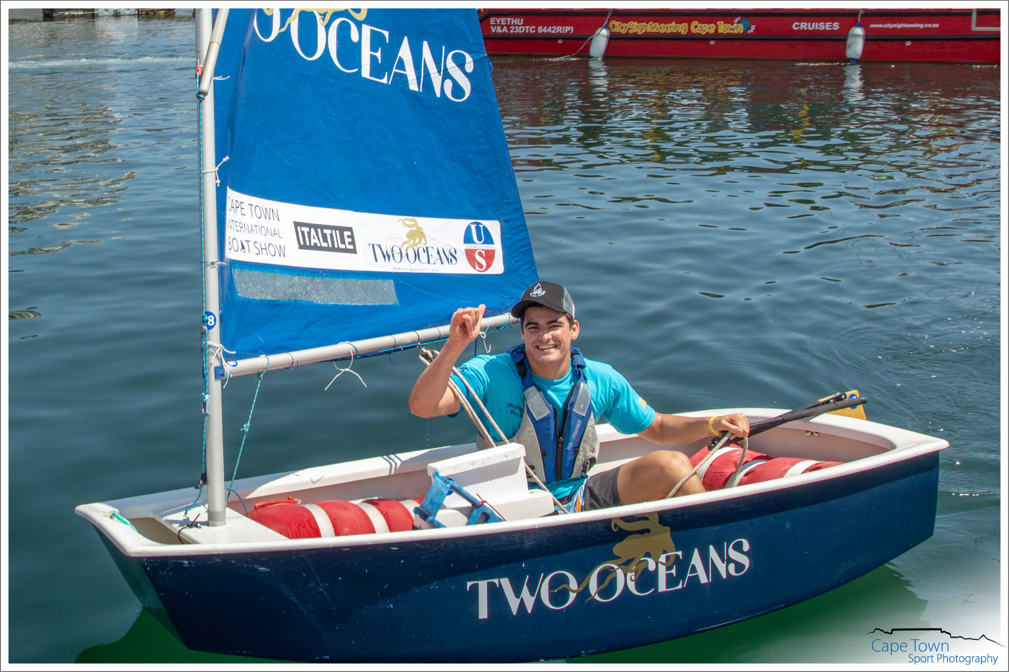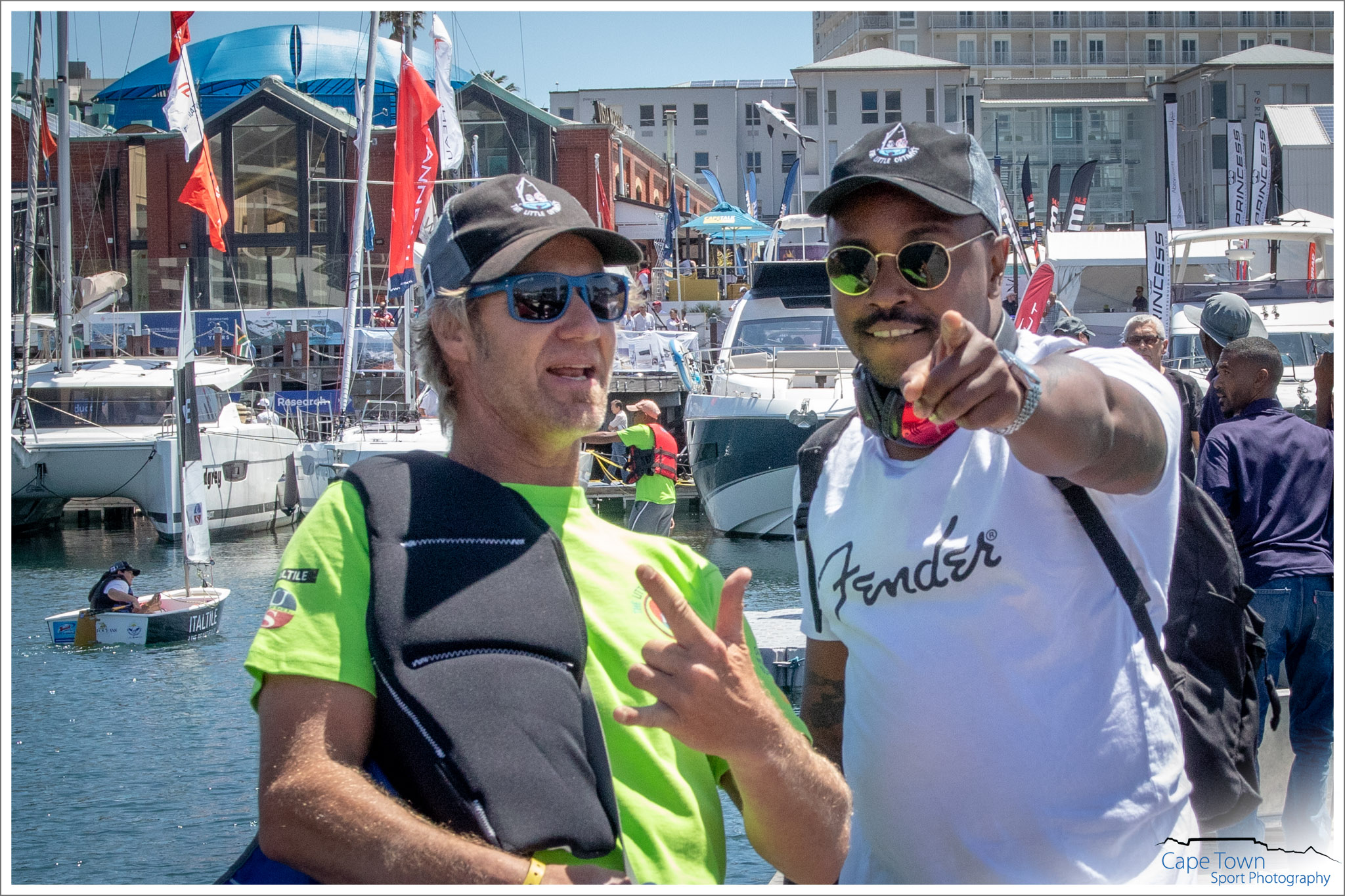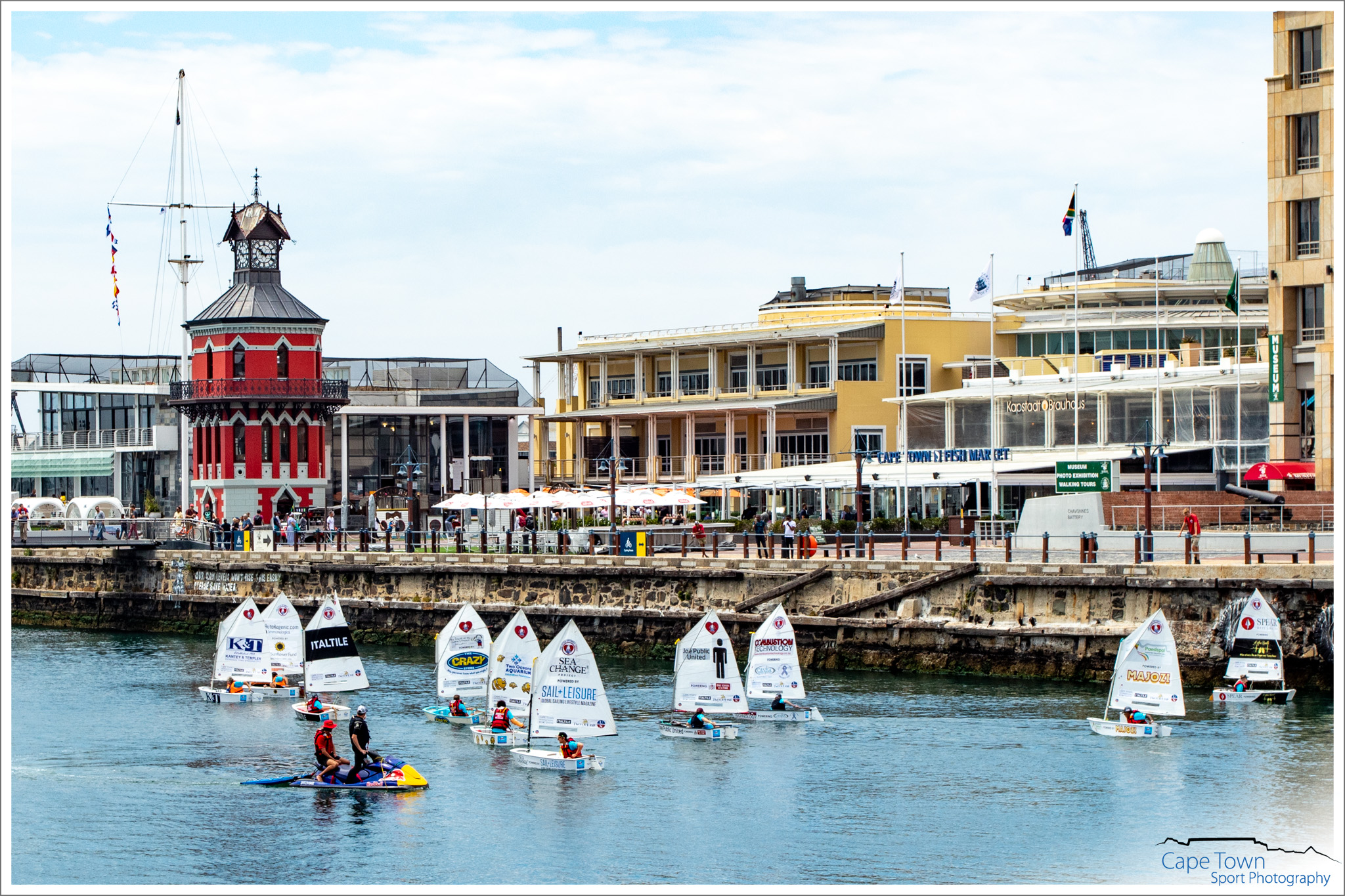 The inaugural race took place on Sunday 21 October 2018 in gusty and tricky conditions on a beautiful day in Cape Town. 42 Optimist sailors set off on a tricky 3 lap course through the V & A Waterfront, watched by 1000s of spectators. With the magnificent backdrop of Table Mountain, the sailors raced for glory and survival. The competitors comprised of adults made up of medical survivors, local celebrities, Captains of Industry and some pro sailors. Three separate start, beginner, intermediate and pro sailors, allowed for a good handicap and a chance for those who had only learned to sail days before. This unique race was all about overcoming the odds and surviving. It’s about inspiring sick and needy kids to never ever give up and find a passion to live for. So, as in the race of life, this race had some unique curveballs and obstacles for the sailors to overcome. Not only did the wind squalls and gusts in the second basin cause havoc, but so did the pedestrian bridge that opened and closed at will, along with “water pistol armed and dangerous” local celebrities Kieno Kammies and Tanya Neft on their own bigger yacht. These were the disrupters. The competitors had to get past these to cross the line.